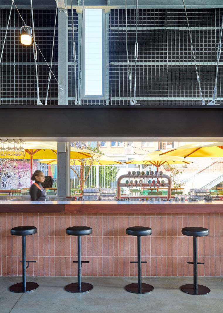 The interiors draw on a palette of raw, textural materials, terracotta tiling, block work, steel, timber, and tactile finishes, creating a warm, industrial aesthetic that speaks to the site’s heritage while remaining unmistakably contemporary. Expansive openings connect the inside to a generous alfresco area, allowing the venue to flow seamlessly from day to night and across seasons.